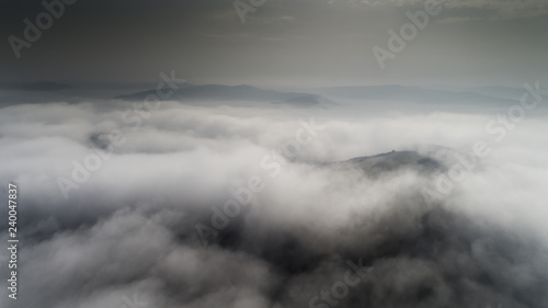Aerial view from a drone about the Transylvanian valleys on a foggy morning, above Sic village, Transylvania, Romania