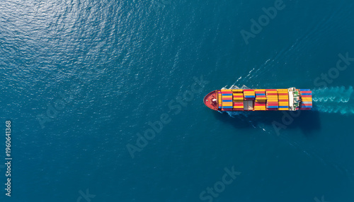 Aerial view from drone, Container ship or cargo shipping business logistic import and export freight transportation by container ship in open sea, Container loading cargo freight ship boat. Global Shi