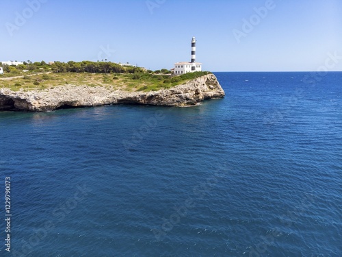 Aerial view, lighthouse Portocolom, Punta de ses Crestes, Potocolom, Majorca, Balearic Islands, Spain, Europe
