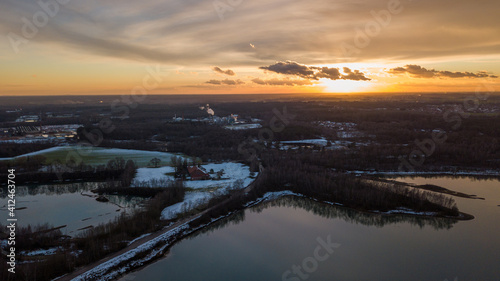 Aerial view of a beautiful and dramatic sunset over a forest lake reflected in the water, landscape drone shot. Blakheide, Beerse, Belgium. High quality photo