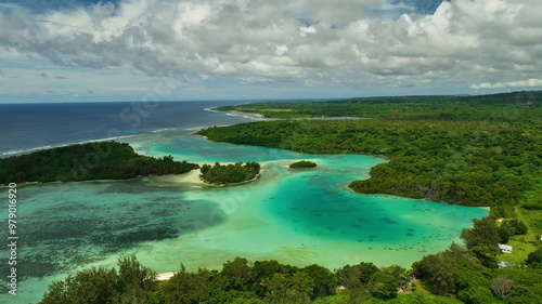 Aerial view of a beautiful tropical island with lush palms and turquoise waters, Eton, Vanuatu.