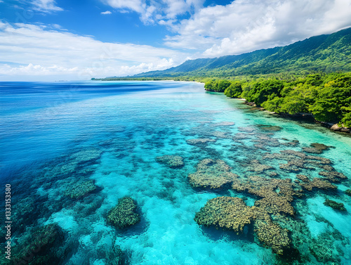 Aerial view of a breathtaking coral reef, crystal-clear turquoise waters, colorful marine life, and a tropical paradise