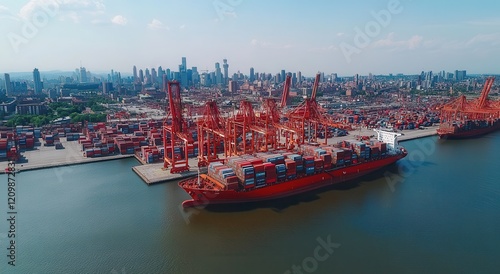 shipping, port, container, vessel, crane, aerial, urban, skyline, transportation, logistic, industry, good, commerce, infrastructure, ocean, maritime, trade, cargo, delivery, harbor, waterfront, distribution, technology, equipment, freight, business, travel, city, seaport, transit, loading, unloading, blue, day, economy, collaboration, import, export, container ship, network, global, activity