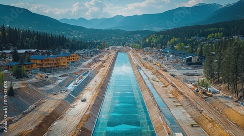construction, water, grooved, mountain, landscape, tree, building, development, infrastructure, excavation, machinery, earth, gravel, site, engineering, nature, environment, sky, cloud, project, rural, progress, tool, labor, transport, design, planning, material, labourer, safety, terrain, urban, view, area, river, basin, flow, equipment, road, access, housing, community, resource, vista