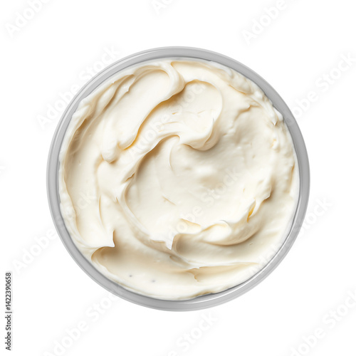 Aerial view of a container filled with smooth white cream with swirling patterns on a transparent background png