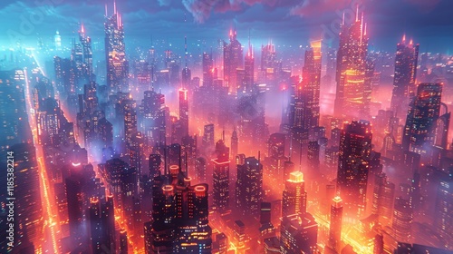 hazy, architecture, technology, futuristic, city, city landscape, atmosphere, concept, skyscraper, skyline, neon, fantasy, reality, metropolis, digital, abstract, illustration, graphic, light, science fiction, ai, glow, design, modern, urban, night, urbanism, style, generative, building, virtual, future, art, generated