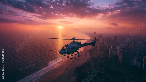 Aerial view of a helicopter flying over a coastal city at sunrise, ocean reflecting the dawn light, skyscrapers and parks below, vibrant and serene atmosphere,