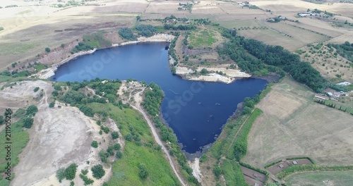 Aerial view of a lake and a river in Pomezia near Rome. Country green and trees. Lake solfatara and Lake posta fibreno
