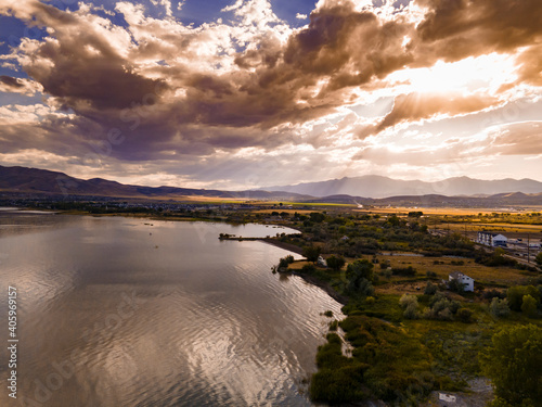 lake, aerial, dramatic, cloud, sky, water, landscape, sunset, nature, blue, sunrise, dusk, beautiful, mountain, sun, summer, view, travel