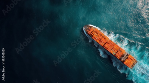 Aerial view of a large cargo ship transporting containers across the ocean. Concept of global shipping, logistics, and international trade for supply chain.