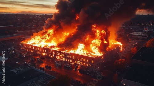 Aerial view of a large fire engulfing an urban building. Flames and smoke