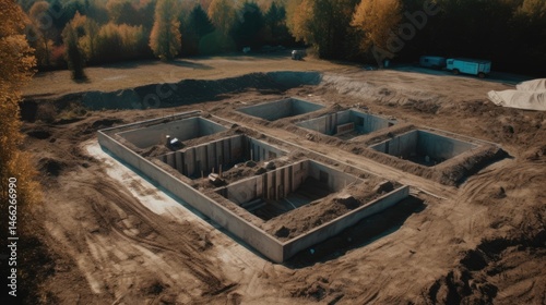 Aerial view of a large house foundation from above with clean lines and modern architecture