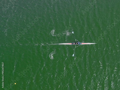 up high, aerial, athlete, boat, competition, daytime, drone, emerald, exercise, fitness, green, lake, motion, nature, ocean, outdoors, paddle, recreation, rythm, ripple, oarsman, rowing, sea, solo, sport, summer, turquoise, view, water, water sport, wave