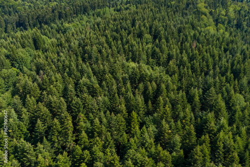 Aerial view of a lush green forest with a road running through it, captured in summer.