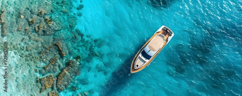 yacht, boat, water, ocean, sea, blue, turquoise, clear, crystal, summer, vacation, luxury, travel, aerial, view, top, down, perspective, sky, horizon, sun, light, wave, ripple, calm, tranquil, peaceful, beauty, nature, coastal, coastline, sandy, beach, rock, stone