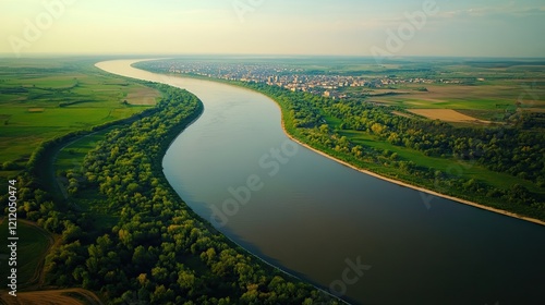 river, aerial, landscape, meandering, farmland, town, nature, scenery, drone, view, water, green, summer, countryside, rural, field, agriculture, sky, horizon, tree, vegetation, bend, curve, flowing, calm, peaceful, serene, beautiful, scenic, travel, geography, environment, ecology, photo, image, picture, background, panoramic, majestic