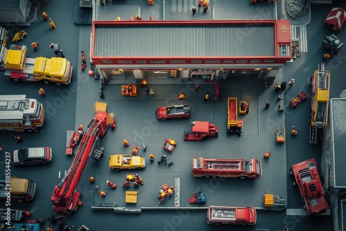 aerial, view, miniature, fire, station, city landscape, city, building, street, road, car, emergency, vehicle, rescue, scene, model, toy, diorama, scale, small, figurine, people, men at work, fireman, firefighter, accident, crash, damage, yellow, red, grey, orange, crane, lift, detail, top, overhead, perspective, urban, construction, response, team, building