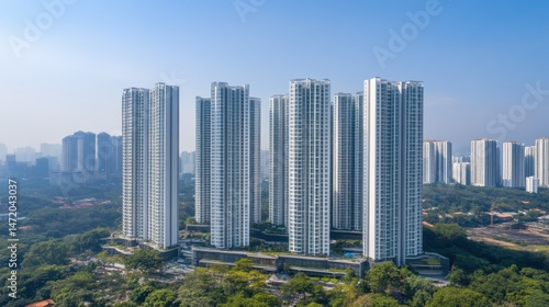 Aerial view of a mixed-use real estate development with residential towers, shopping centers, and parks