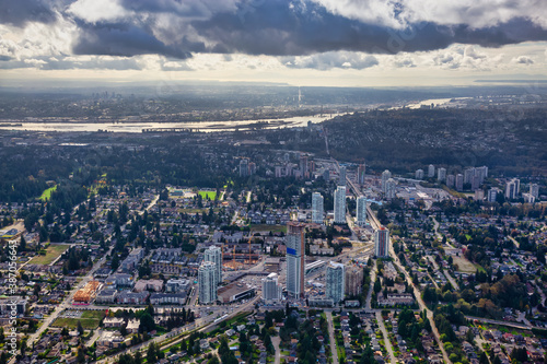 Aerial view of a modern cityscape during a sunny summer morning. Taken in Burnaby, Greater Vancouver, British Columbia, Canada.