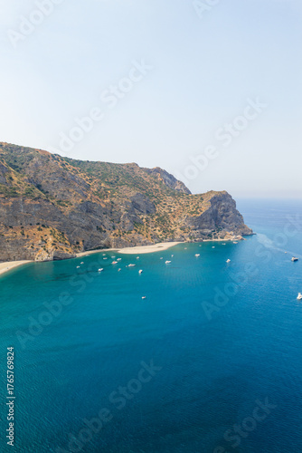 Aerial view of a rugged coastline where golden cliffs meet the turquoise sea, dotted with boats under a clear sky, Marinello, Città metropolitana di Messina, Italy.