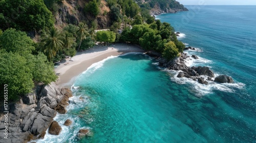 aerial, view, tropical, bay, secluded, beach, coast, ocean, sea, water, turquoise, blue, green, lush, vegetation, tree, rock, shoreline, island, paradise, remote, nature, scenic, landscape, exotic, summer, vacation, travel, destination, clear, calm, sunlight, sparkling, refreshing, peaceful, tranquil, serene, beautiful, viewpoint, horizon