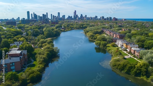 Aerial view of a serene river surrounded by lush greenery and a vibrant skyline.