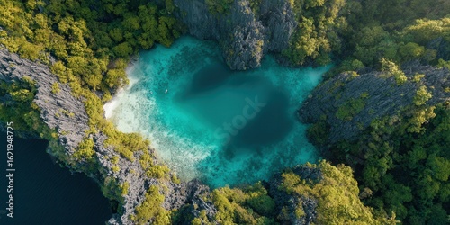 Aerial view of a serene turquoise lagoon surrounded by lush green cliffs and rocky formations