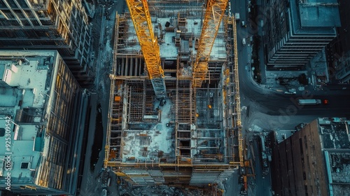 construction, building, crane, yellow, steel, beam, frame, skyscraper, city, urban, development, architecture, concrete, glasses, window, metal, rebar, structure, city landscape, progress, infrastructure, aerial, view, overhead, drone, foundation, site, work, men at work, equipment, tool, industry, engineering, modern, future, growth, technology, project, downtown, skyline, tied-up, transformation, investment, design, change, opportunity