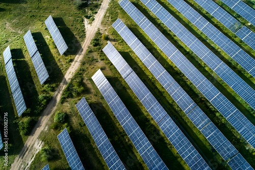 Aerial view of a solar farm with rows of solar panels generating renewable energy. Photo.