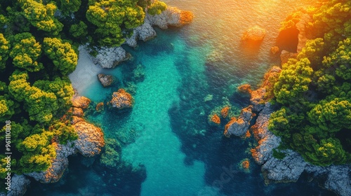 aerial, view, coastline, green, greenery, lush, rocky, cliff, turquoise, water, beach, sand, sun, sunset, gold, light, warm, glow, natural, beauty, tranquil, serene, tropical, paradise, ocean, sea, shore, island, landscape, nature, photo, drone, summer, holiday, vacation, travel, adventure