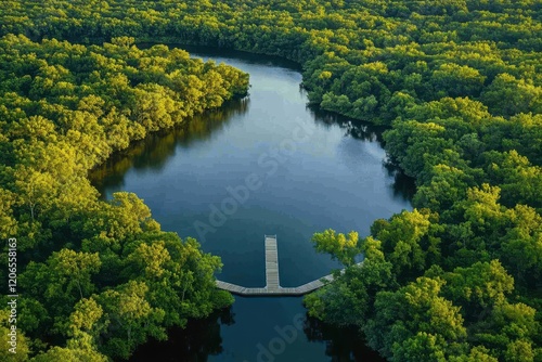 lake, river, dock, pier, forest, tree, wood, greenery, nature, landscape, aerial, view, overhead, summer, sunlight, water, calm, serene, peaceful, tranquil, green, lush, vibrant, foliage, canopy, wilderness, park, reserve, ecology, environment, ecosystem, scenic, beautiful, picturesque, idylli, calmness, relaxation, escape, journey, adventure, exploration, travel, vacation, holiday, get-away, refuge, sanctuary, pristine