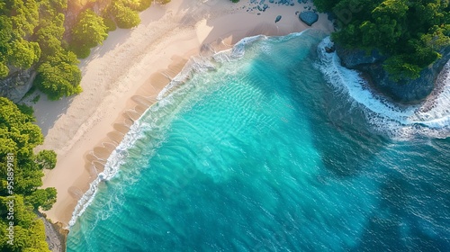 beach, shore, coast, tropical, ocean, sea, water, blue, turquoise, wave, foam, sand, cliff, rock, forest, foliage, green, lush, sunlight, sunshine, aerial, view, overhead, landscape, nature, paradise, vacation, travel, summer, relaxation, scenic, beautiful, pristine, untouched, tranquil, serene, calm, peaceful