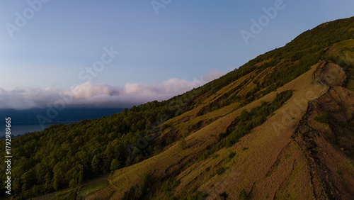 Aerial view of a vibrant hillside where golden sunlight meets lush greenery, contrasting with the cool blue sky and distant clouds, Mount Batur, Bali, Indonesia.