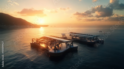 Aerial View of an Innovative Tidal Power Generator at Sunrise: Coastal Engineering Installation Highlighted in Dramatic Lighting.