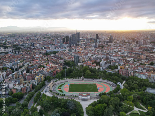 Aerial view of Arco della Pace in Milano, north Italy. Drone photography of Arch of Peace in Piazza Sempione, near Sempione park in the heart of Milan, Lombardy and Sforza Castle.