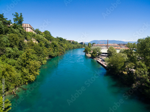 Aerial view of Arve an Rhone river confluent in Geneva Switzerl