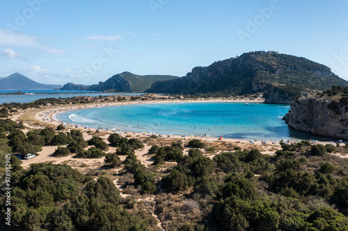 Aerial view of beautiful azure bay and sandy beach with clear sky and tranquil sea, Romanos, Greece.