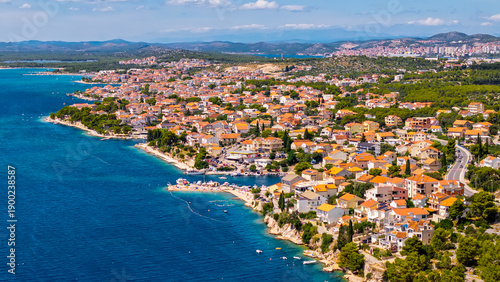 Aerial view of Brodarica coastal village near Sibenik Bridge Croatia with Adriatic Sea and Mediterranean houses