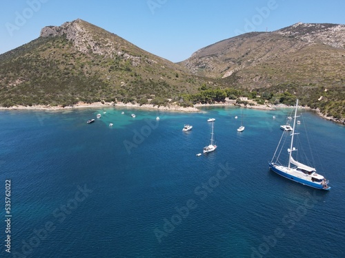 Aerial view of Cala Moresca and Figarolo Island in Golfo Aranci, north Sardinia. Birds eye from above of yacht, boats, crystalline and turquoise water. Tavolara Island in the background, Sardegna.