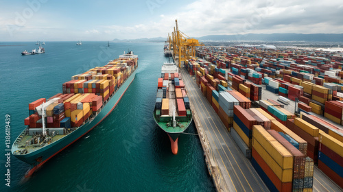 Aerial view of cargo ships loading and unloading containers at a busy port, showcasing maritime trade and logistics.