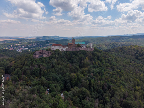 Aerial view of Castle Wartburg with forest in the foreground a blue sky with clouds in the background