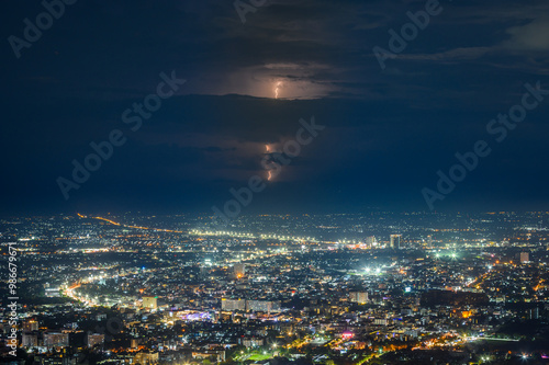 aerial view of Chiang mai City night from the Doi Suthep view point in raining storm clouds with lightning, Chiang mai,Thailand