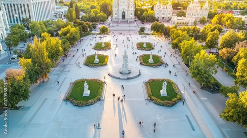 Aerial view of city park square with people, trees, buildings and vibrant greenery on a sunny day