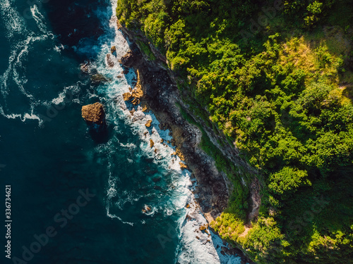 Aerial view of cliff and ocean with waves in Bali.