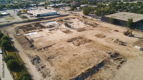 construction, site, aerial, view, development, urban, excavation, building, project, land, ground, earth, machine, equipment, shoveling, bulldozer, vehicle, industry, progress, work, zone, plot, area, property, foundation, concrete, structure, infrastructure, city, town, community, growth, business, investment, future, planning, expansion