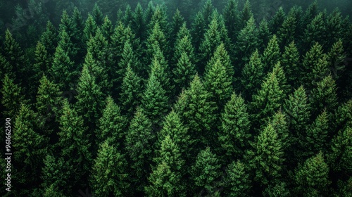 Aerial view of dense evergreen forest showcasing lush green trees in early morning light