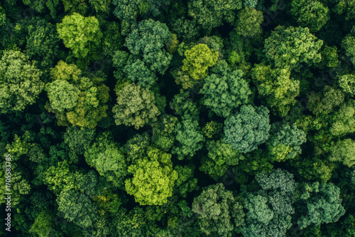 Aerial view of dense green rainforest canopy with various shades of green and lush foliage, showcasing vibrant and rich biodiversity of forest environment
