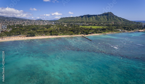 water, sea, beach, ocean, sky, blue, landscape, nature, coast, tropical, travel, summer, island, sand, coastline, vacation, panorama, tour tourism, lagoon, holiday, sun, diamond head, hawaii, oahu, honolulu, waikiki, aerial, up high, city, building, resort, destination, recreation, surf, reef, turquoise, us, us, pacific ocean