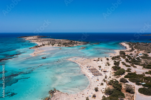 Aerial view of Elafonissi Beach in Southwest Crete, Greece with turquoise waters and sandy shores