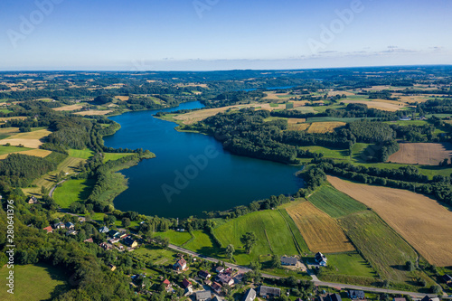 Aerial view of Kashubian Landscape Park. Kaszuby. Poland. Photo made by drone from above. Bird eye view.